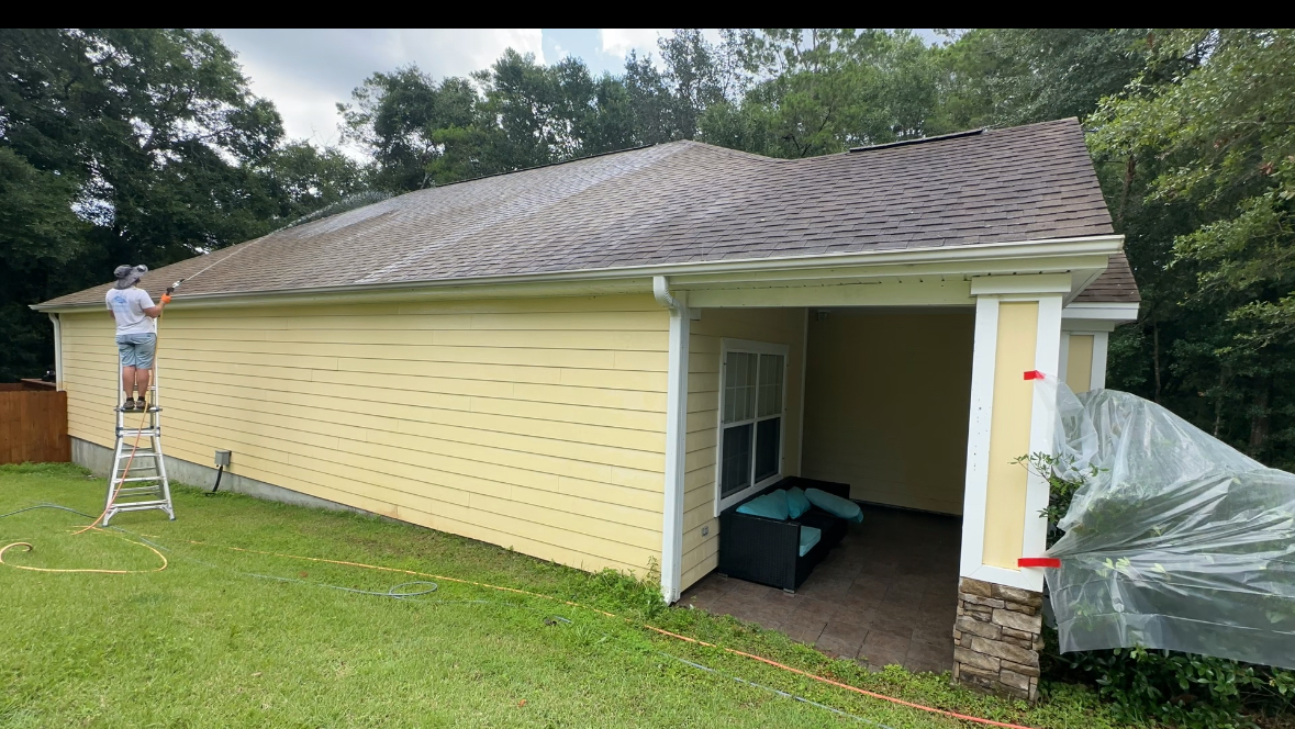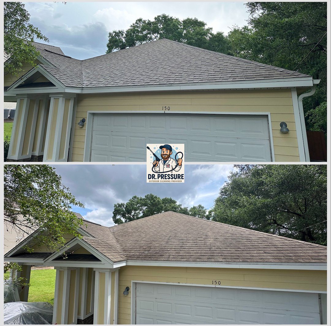 Dr. Pressure was called out to restore this residential roof that had significant discoloration caused by algae, mildew, and organic buildup. Using our low-pressure soft washing method, we safely and effectively removed years of staining without causing any damage to the shingles.
